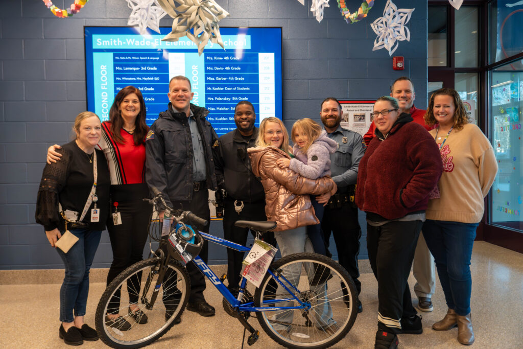 “They wanted to extend a hand to welcome themselves to the community,” Koehler explained, “but also bridge the gap of communication between schools and the township police department.” He continued, “We selected a student who could really use a bike over the holiday season. Vada is so kind and considerate to all students. She’s willing to help. She’s a hard worker in the classroom, and she’s such a leader around here. There was no better, more deserving student at this time.”
