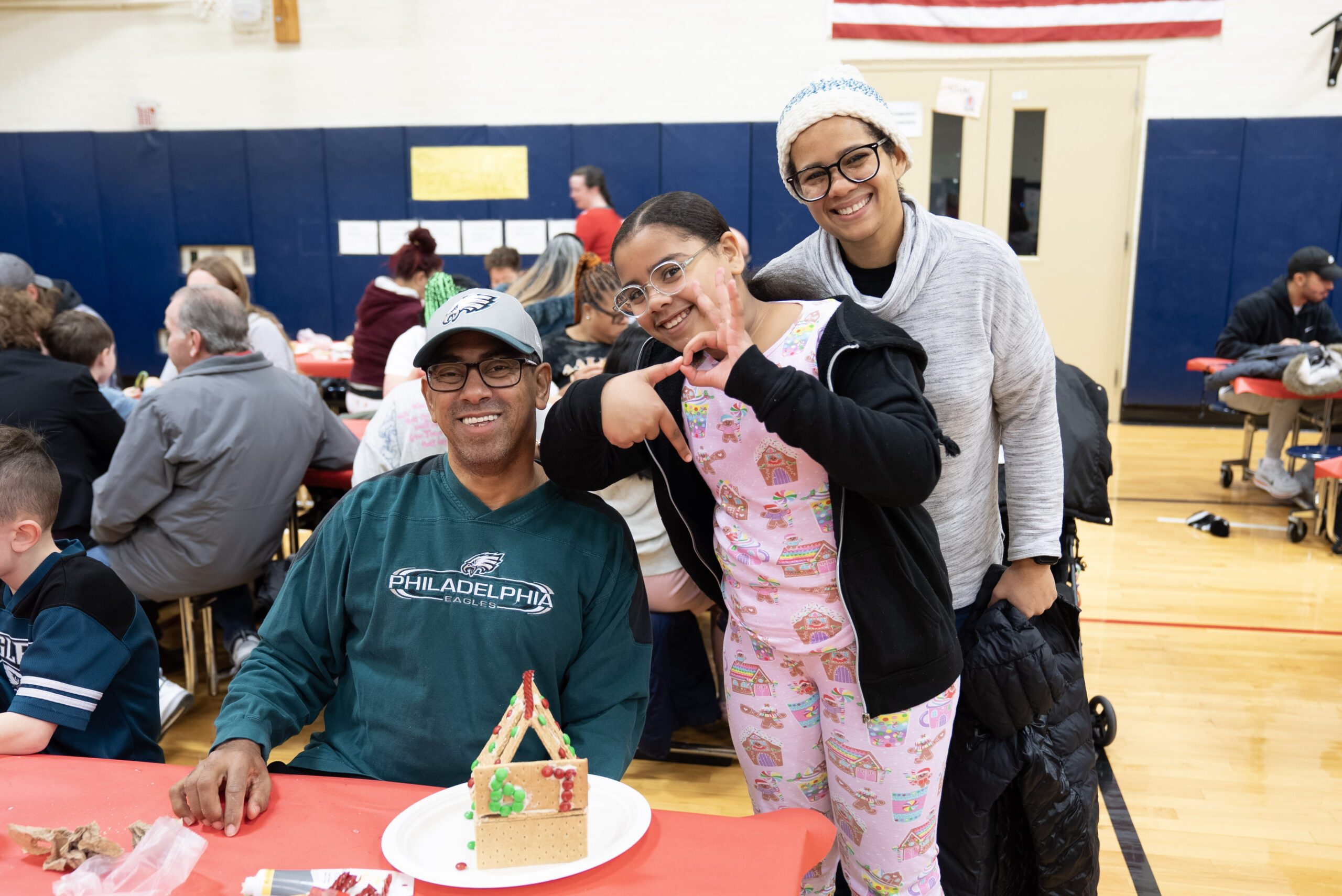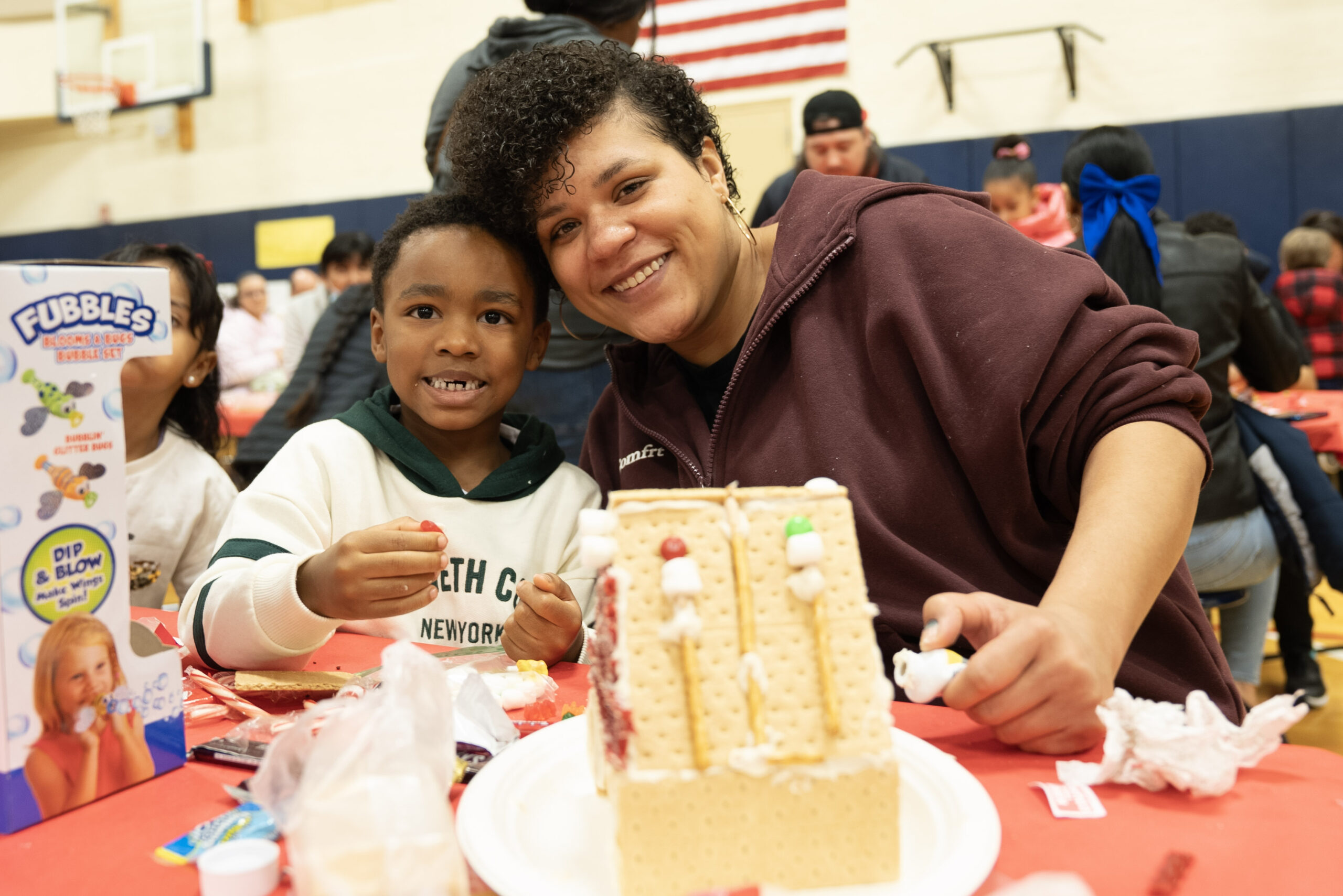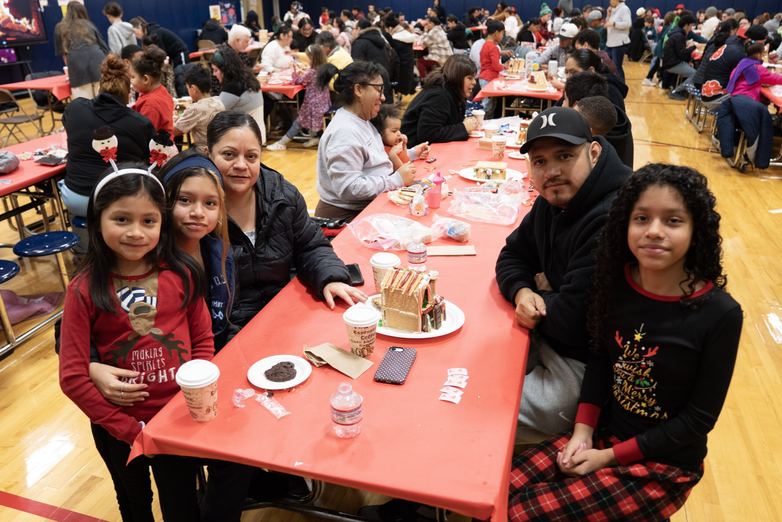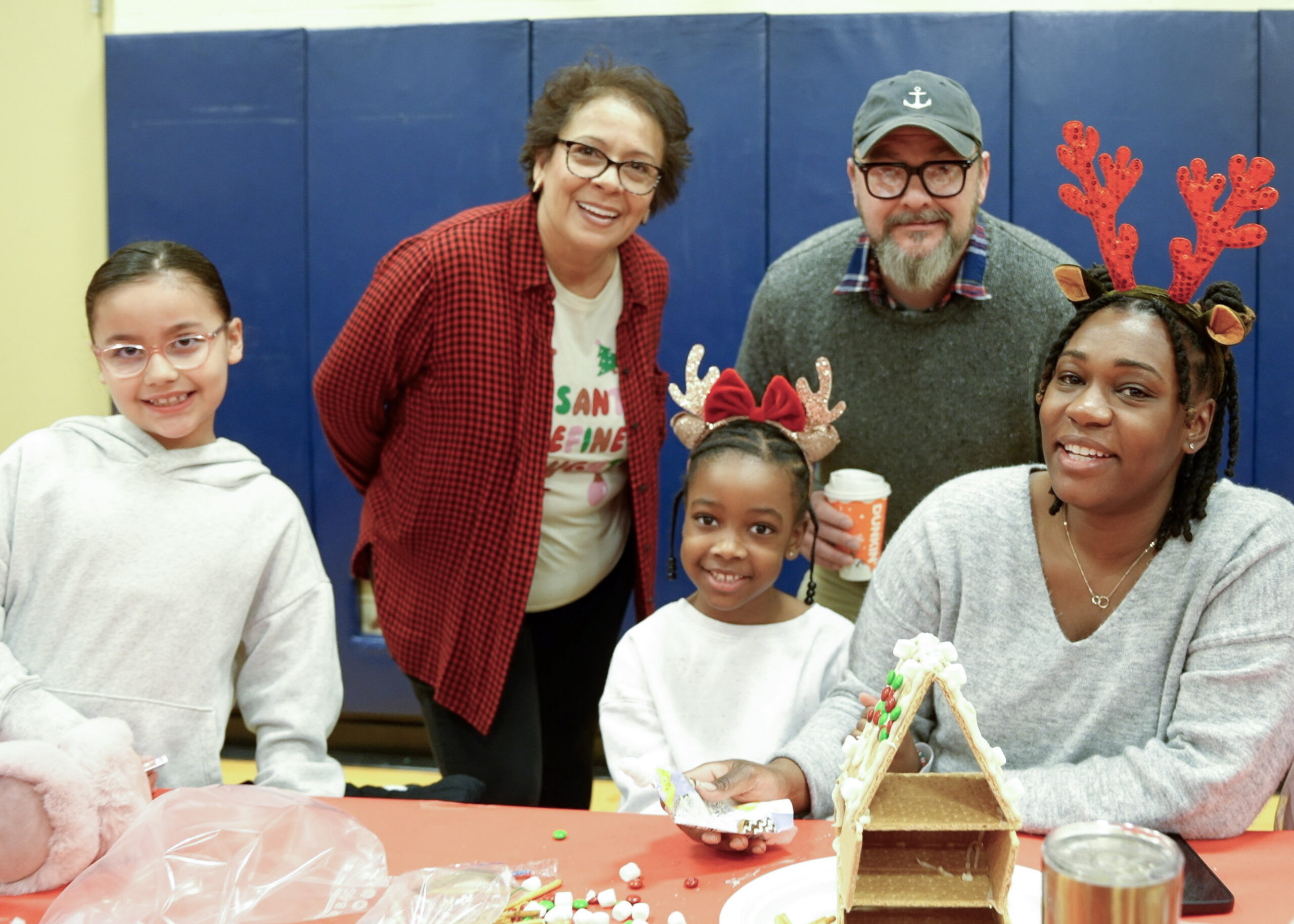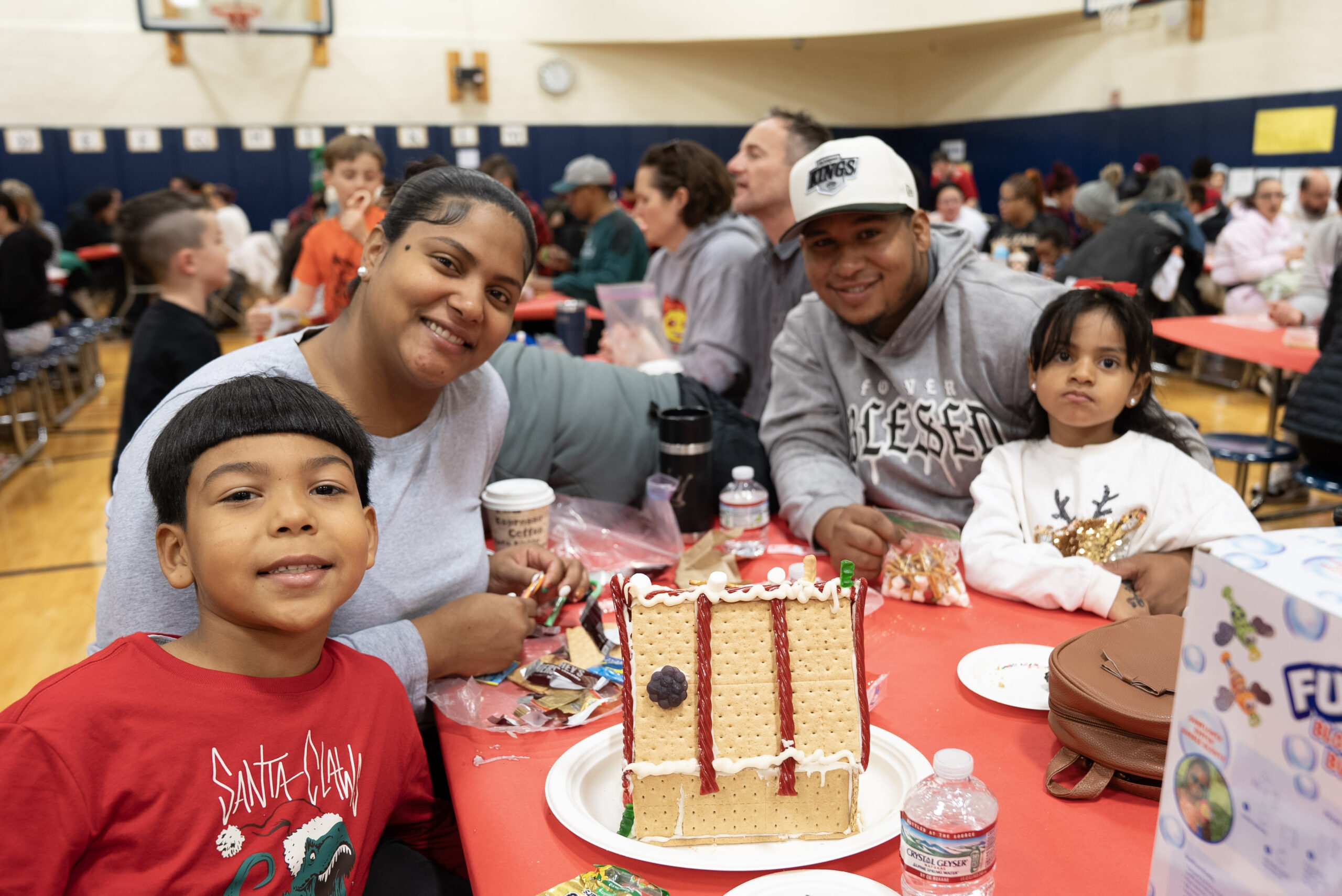 This year, more than 65 families filled the gym for an afternoon that felt warm and welcoming from the moment the doors opened. Staff members arranged tables covered in red paper, prepared trays of supplies, and greeted families as they stepped inside. The tables held graham crackers, icing in squeeze tubes, bowls of candy, pretzels, and a collection of materials that encouraged families to build in any direction they imagined. The gym echoed with the early sounds of children calling out to classmates, caregivers finding their seats, and volunteers helping students gather what they needed.