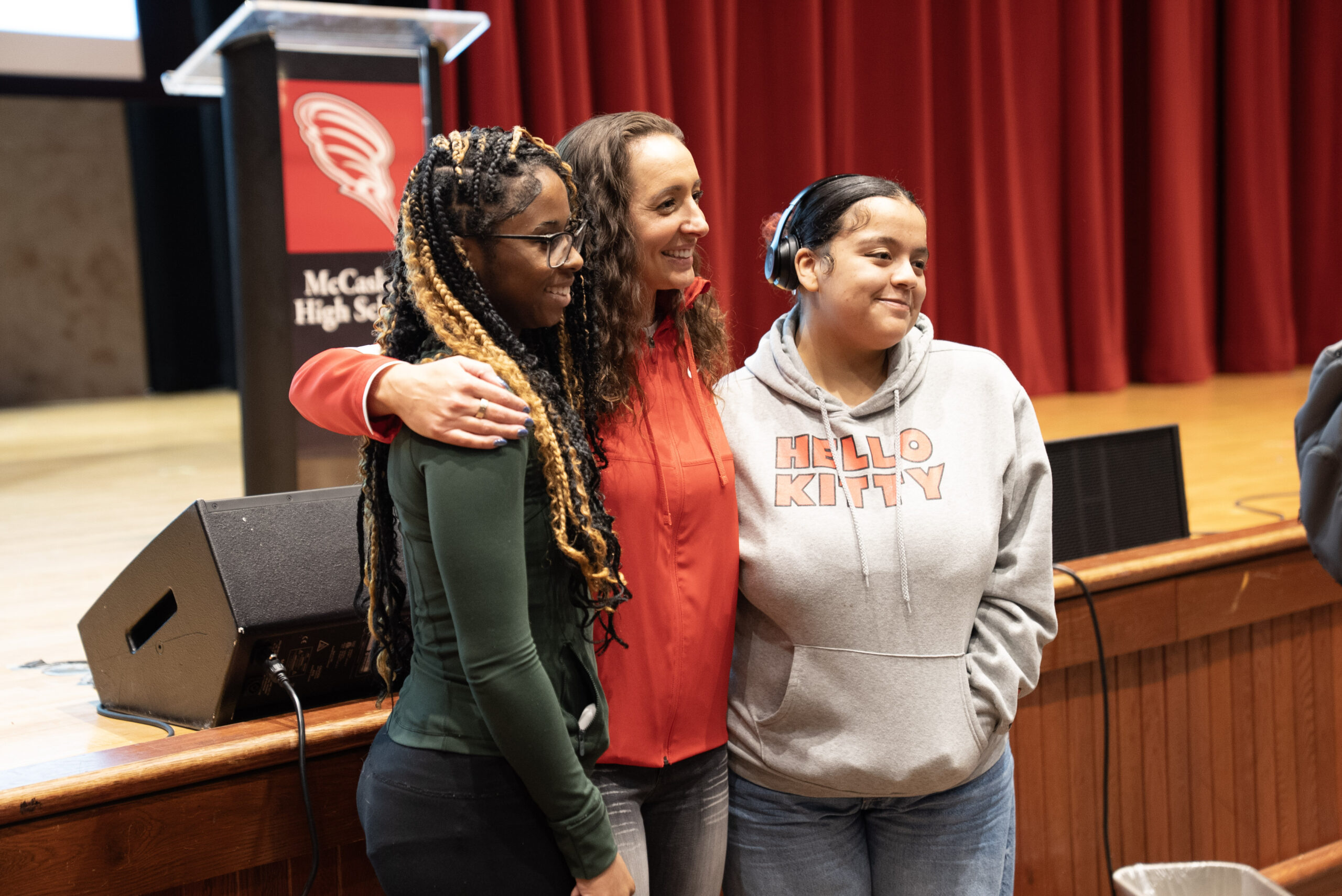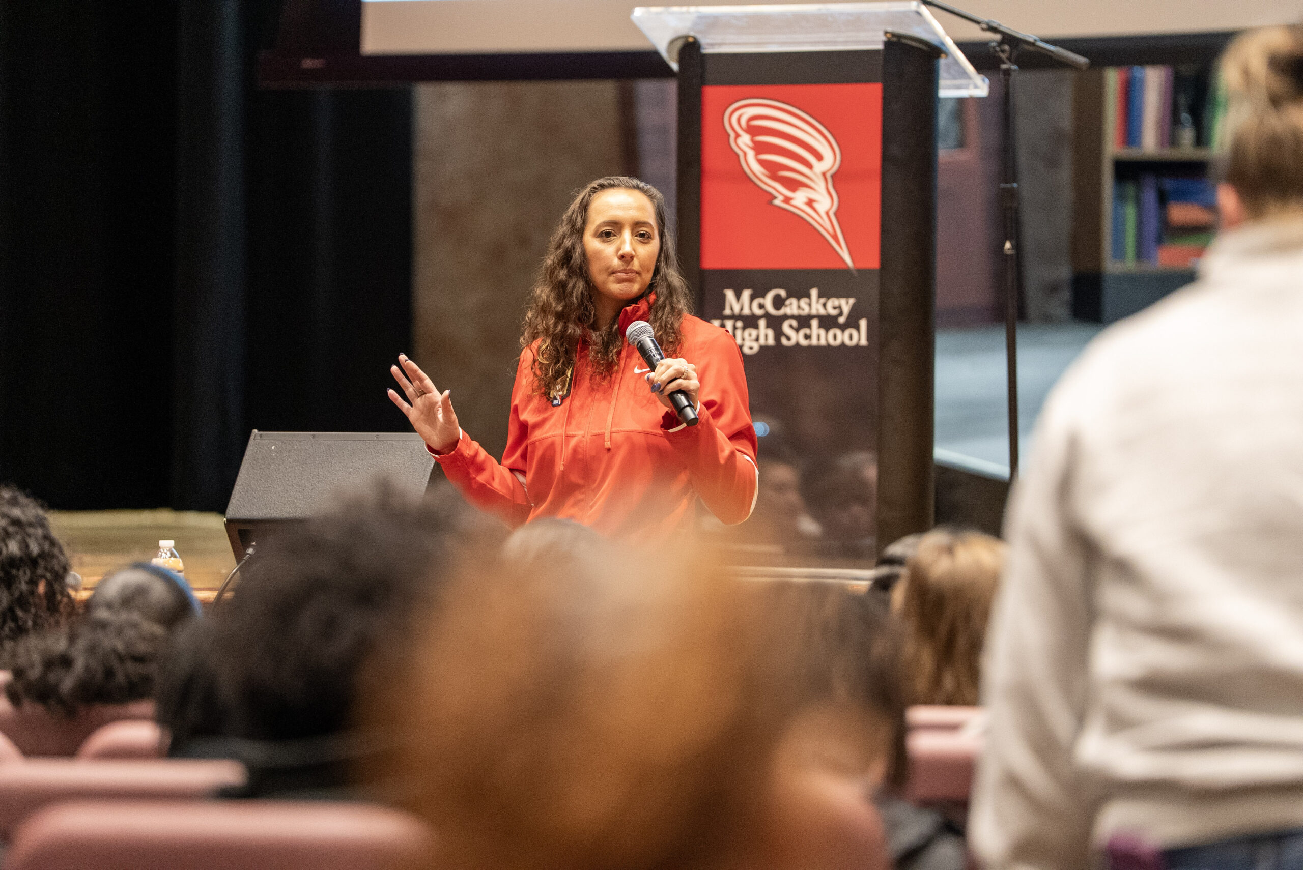 Her visit to McCaskey included two powerful gatherings. The first brought together 500 student athletes for an assembly that highlighted the turning points in her life, the challenges she overcame, and the dedication that carried her to the highest level of her profession. Her message centered on resilience and the courage it takes to step into spaces where representation is still growing. Students listened as she spoke openly about learning from setbacks and choosing to stay focused when the next step felt uncertain.