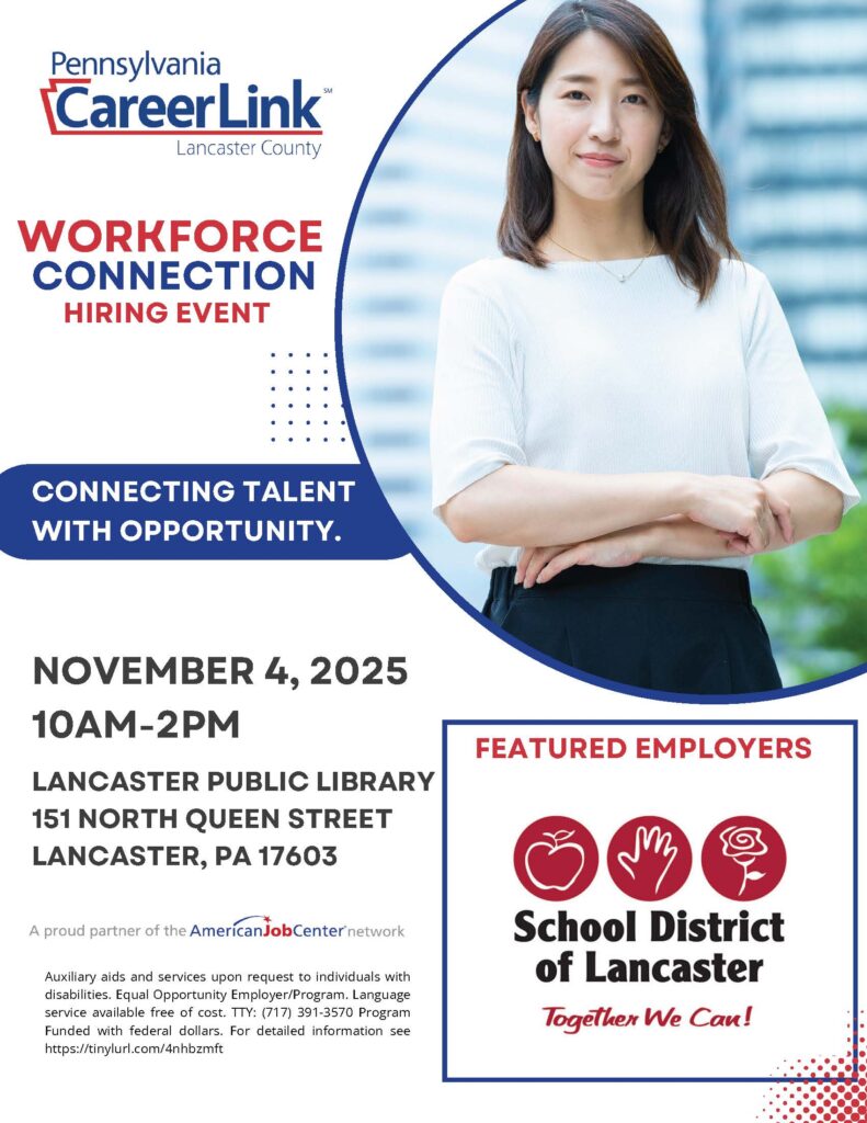 The School District of Lancaster is proud to partner with PA CareerLink Lancaster County for their upcoming Workforce Connection Hiring Event on Tuesday, November 4, 2025. The event will take place from 10 a.m. to 2 p.m. at the Lancaster Public Library, located at 151 North Queen Street.