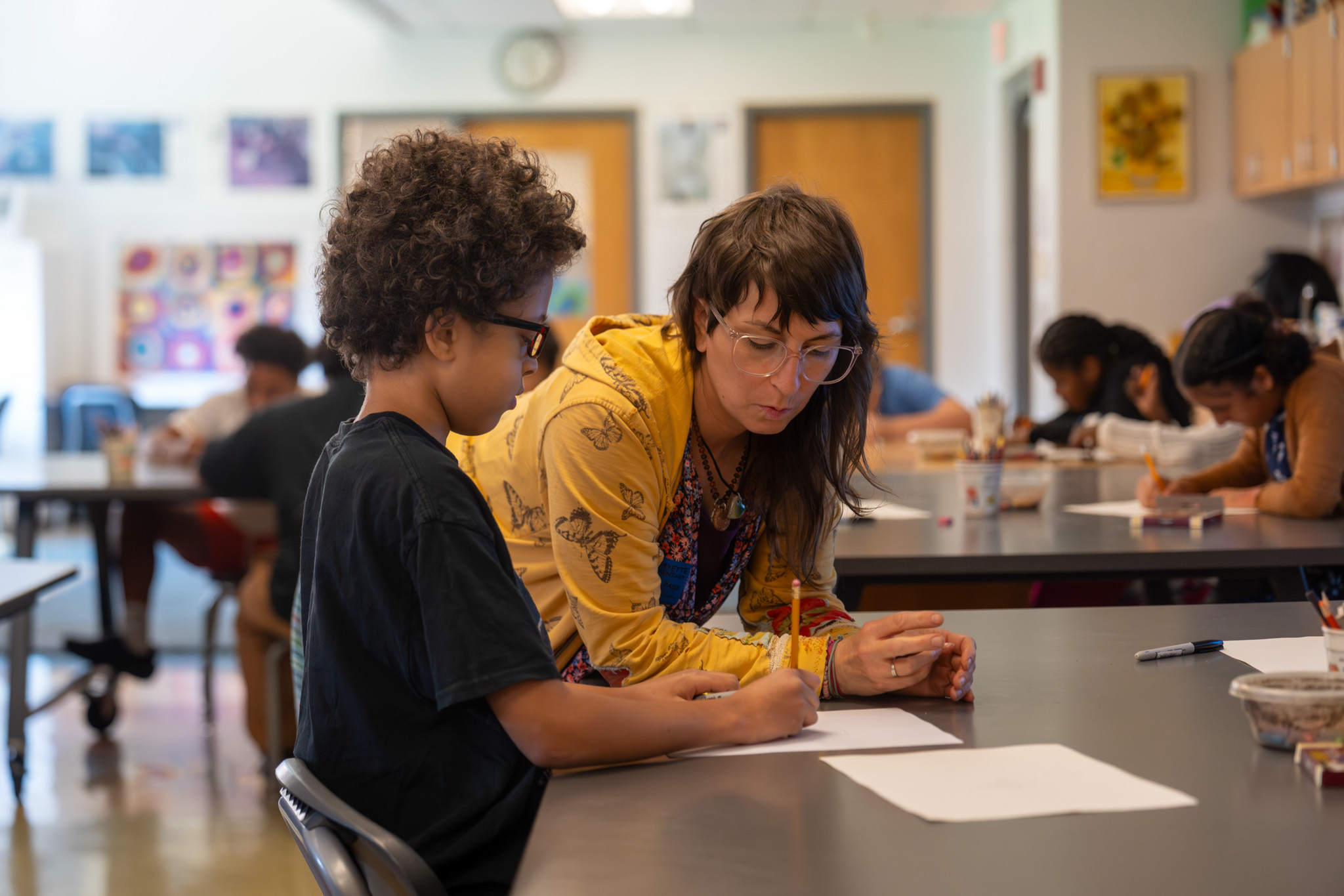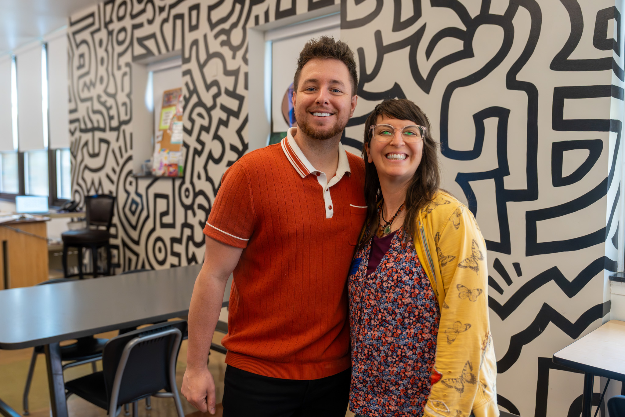 Working alongside art teacher Wesley Blymire, students are exploring how to translate emotion into visual expression. Not literal drawings of moments, but the feeling behind them. A student who loves football might not draw a field or a ball, but instead use bold, energetic lines to represent movement and excitement. Another might use soft colors and flowing shapes to capture a sense of peace or connection. Shauna is guiding them through a process that asks them to think differently about art and about themselves. Every student is contributing and building toward something larger than any one idea.