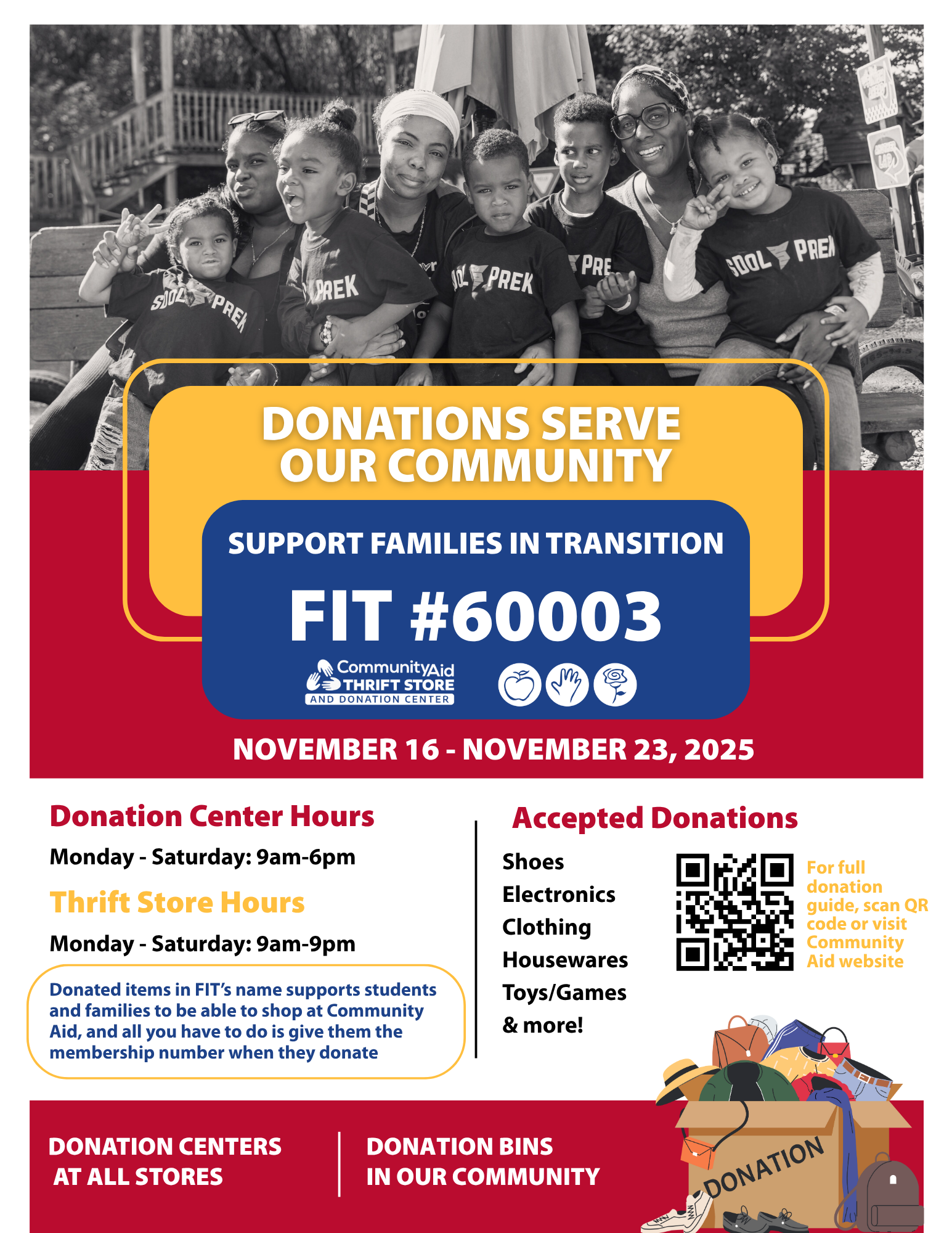 In recognition of ECYEH Awareness Week, the School District of Lancaster is partnering with CommunityAid Thrift Store and Donation Center to support students and families through FIT. From November 16 to November 23, donations made at CommunityAid using the code FIT #60003 will directly benefit students in need.