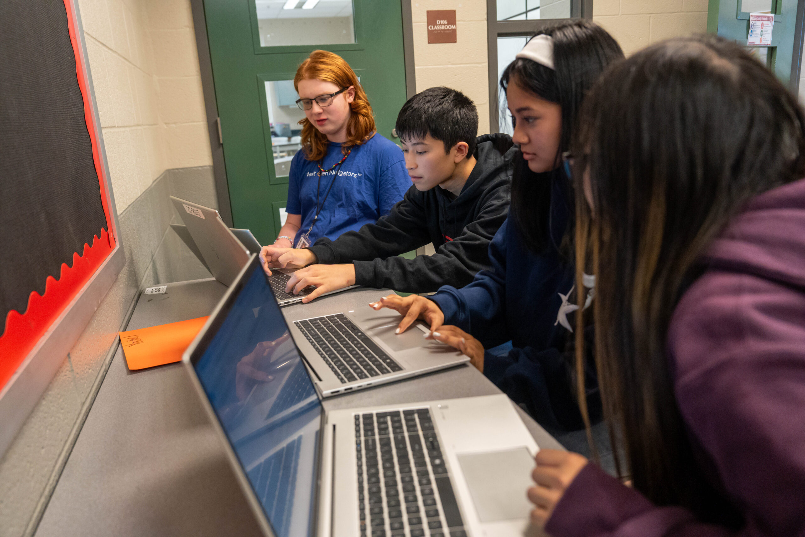 The TECHnadoes formed when computer science teacher Kai Barclay received an invitation from Kinber, a statewide organization focused on digital equity. Kinber offered training and support for schools that wanted to expand digital literacy for adults and families. That opportunity connected McCaskey with Teens Teach Tech, a national program that trains high school students to teach technology skills to adults who may not have had access to this kind of support.