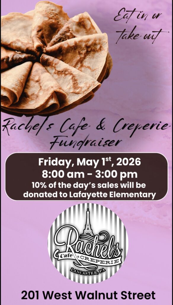 On Friday, May 1, Lafayette Elementary is partnering with Rachel’s Café & Creperie for a special fundraiser. From 8:00 a.m. to 3:00 p.m., 10% of all sales will be donated back to support our school community.