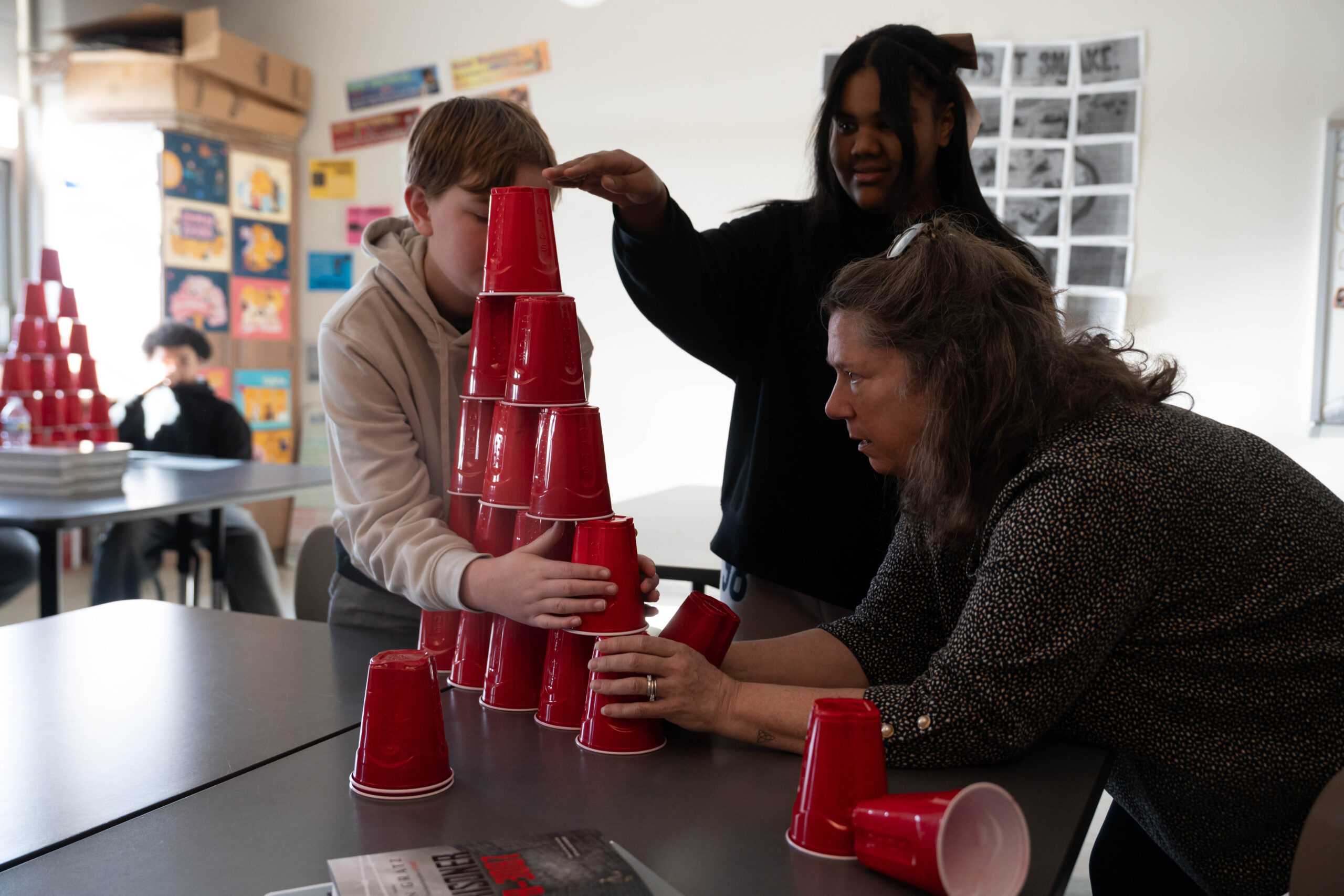 Students rotated through four 30-minute interactive activities, while volunteers remained in assigned classrooms delivering the same lesson to multiple groups. This structure ensured that every student participated fully and contributed to a shared experience across the grade level.