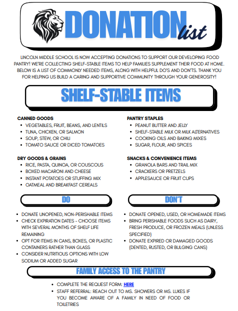 Shelf stable foods, toiletries, hygiene products, gift cards to grocery stores, and monetary donations are all welcome. Items can be brought directly to Lincoln Middle School during the school day.