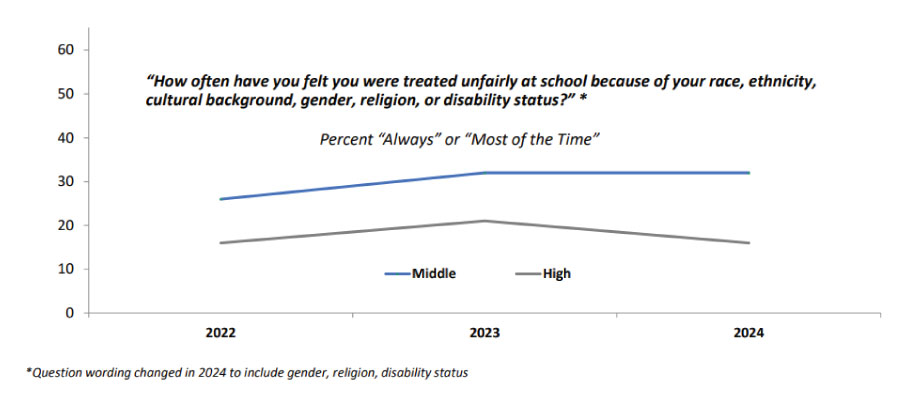 One encouraging sign is the decreasing number of students who indicate they are treated unfairly at school because of their race, ethnicity, or cultural background. The percentage of middle school students who answered “Always” or “Most of the Time” decreased from 32% to 30%. High school agreement decreased from 21% to 16%. Both point to positive trends; however additional work is being done to address the findings.