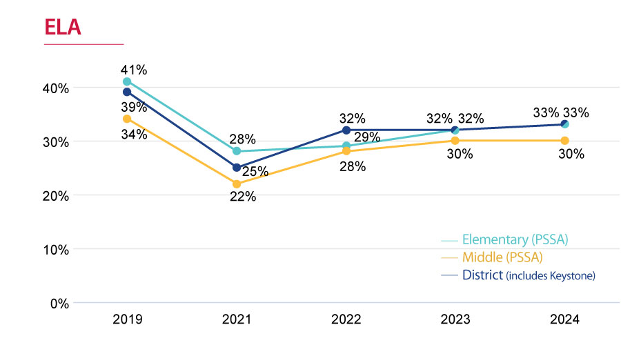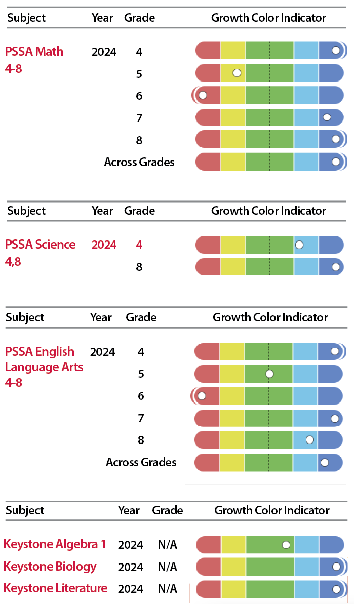 In 2024, some SDoL schools were among the fastest-growing schools in PA. In ELA, McCaskey (top 3%) and Wickersham (top 8%) led the way; in math, it was Carter & MacRae (top 15%) and Washington (top 6%); and in science, Hamilton (top 15%), McCaskey (top 20%), and Wheatland (top 10%) achieved the fastest growth.