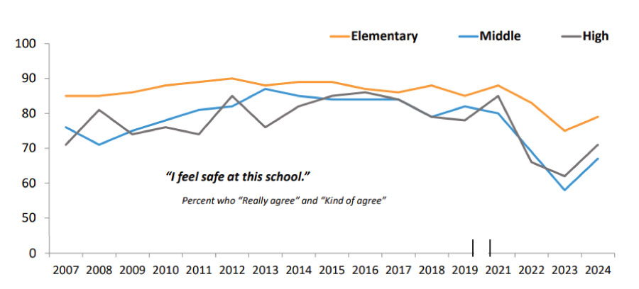 Among the survey highlights are improved views of school safety. While elementary student views remained unchanged, the percentage of middle school students who really or kind of agree that they feel safe at school increased from 58% to 70%. High school responses similarly improved rose from 61% to 70%, the first improvement since 2021.