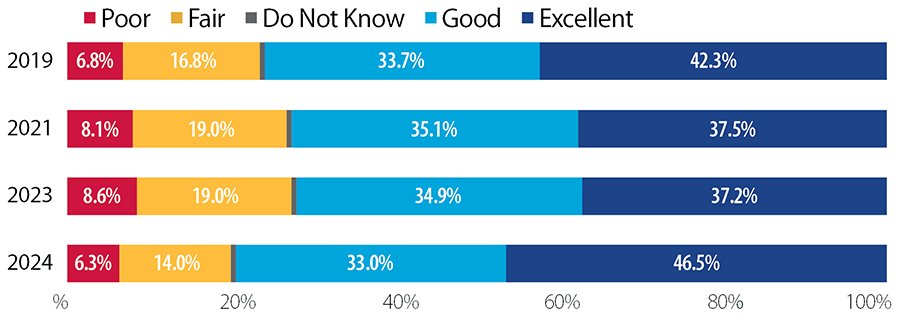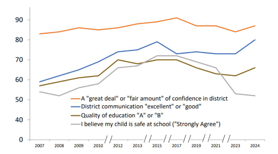 Overall confidence in the district also increased, with 87.4% indicating ‘a great deal’ or ‘a fair amount’ of confidence, the highest since 2017. The percentage of respondents who rate the district’s communications as ‘Excellent’ or ‘Good’ increased from 72.1% to 79.5%, the highest rate since the question was first asked in 2019.