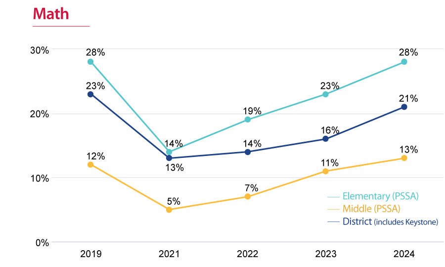 Math proficiency rates saw a significant increase in 2024, increasing by five percentage points from the prior. Current proficiency rates are now only slightly below pre-pandemic levels, especially at the middle school level. Math scores increased due to consistent data-driven instruction, increased student engagement through interactive learning strategies, strong support systems for struggling students, and elective teacher professional development.