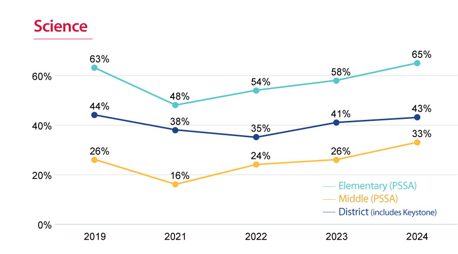 Science proficiency has nearly reached pre-pandemic levels, with proficiency now above 2019 in Elementary and Middle School. We expect this trend to continue in 2025 and hope to exceed the 44% pre-pandemic proficiency benchmark. Science scores increased due to the integration of hands-on learning experiences, the use of phenomenon-based teaching to spark student curiosity, real-world applications of scientific concepts, and collaborative problem-solving activities that enhanced student engagement and understanding.